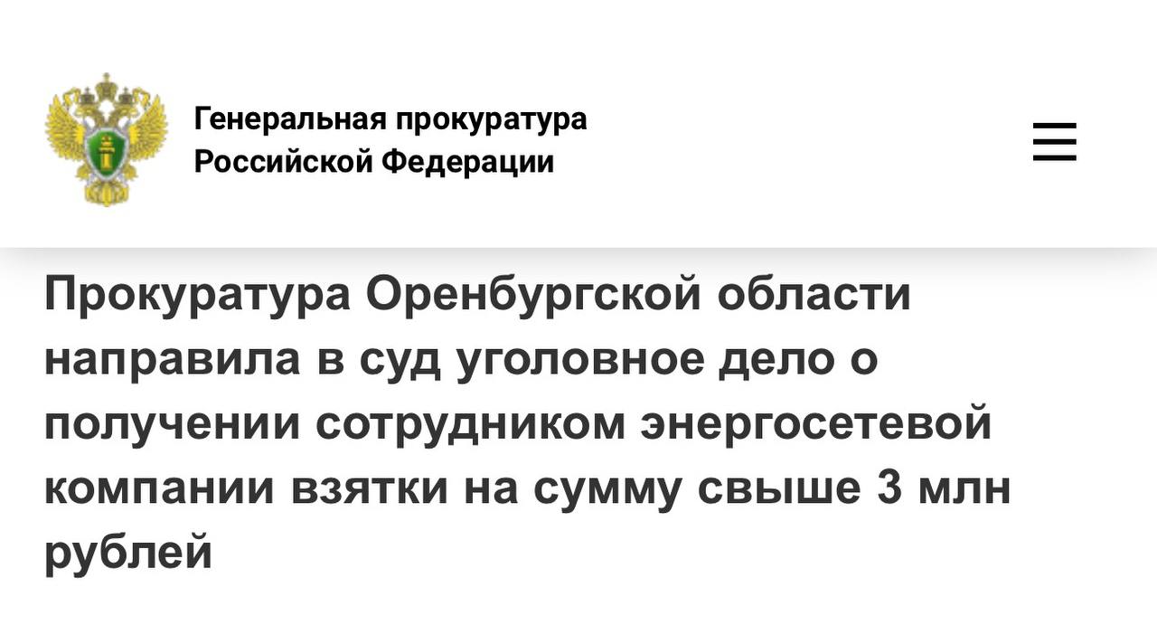 В прокуратуре Оренбургской области утверждено обвинительное заключение по уголовному делу в отношении руководителя подразделения филиала энергосетевой организации. Он обвиняется по п. «в» ч. 5 ст. 290 УК РФ (получение взятки).