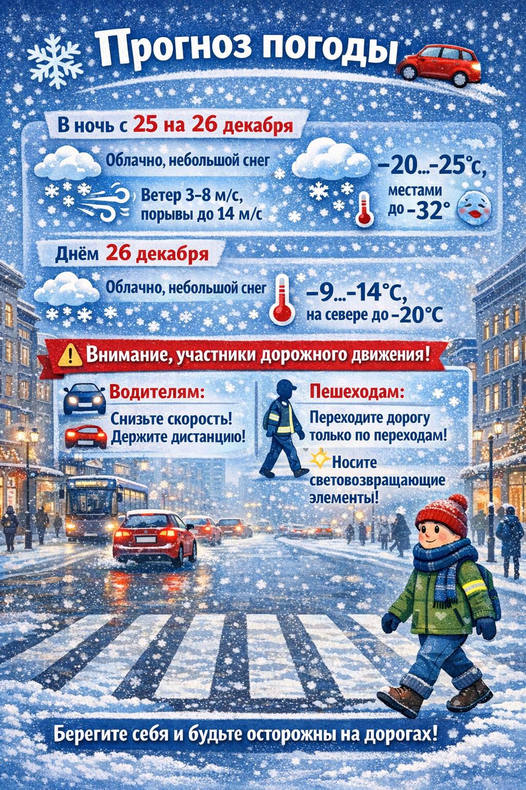 В ночь с 25 на 26 декабря ожидается облачная погода с прояснениями . В западных районах возможен небольшой снег . Ветер южный, юго-западный 3–8 м/с, местами порывы до 14 м/с . Температура воздуха 20…25°, в северных и восточных районах до 32° .