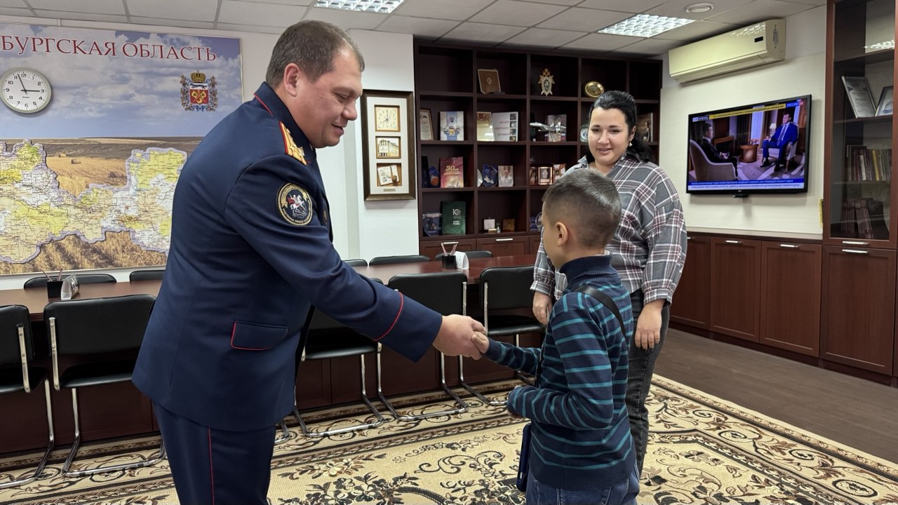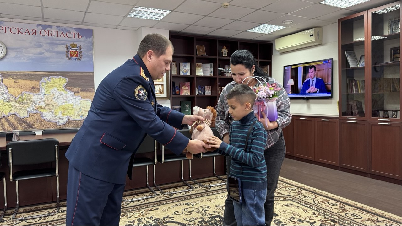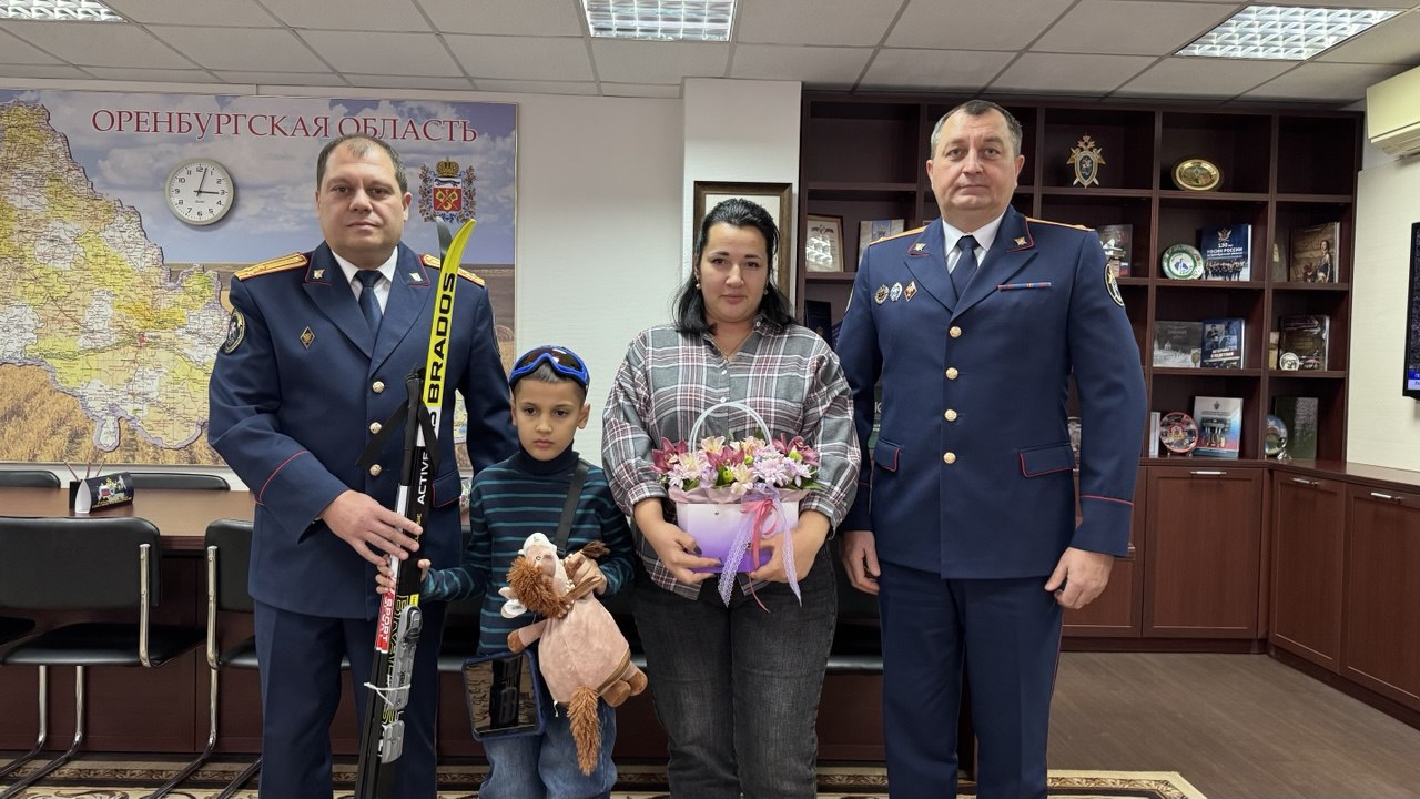 Егора и его маму пригласили в следственное управление по Оренбургской области, где Вячеслав Давидович в праздничной обстановке исполнил мечту мальчика и подарил ему лыжи и маску для прогулок на свежем воздухе, а также сладкий подарок.