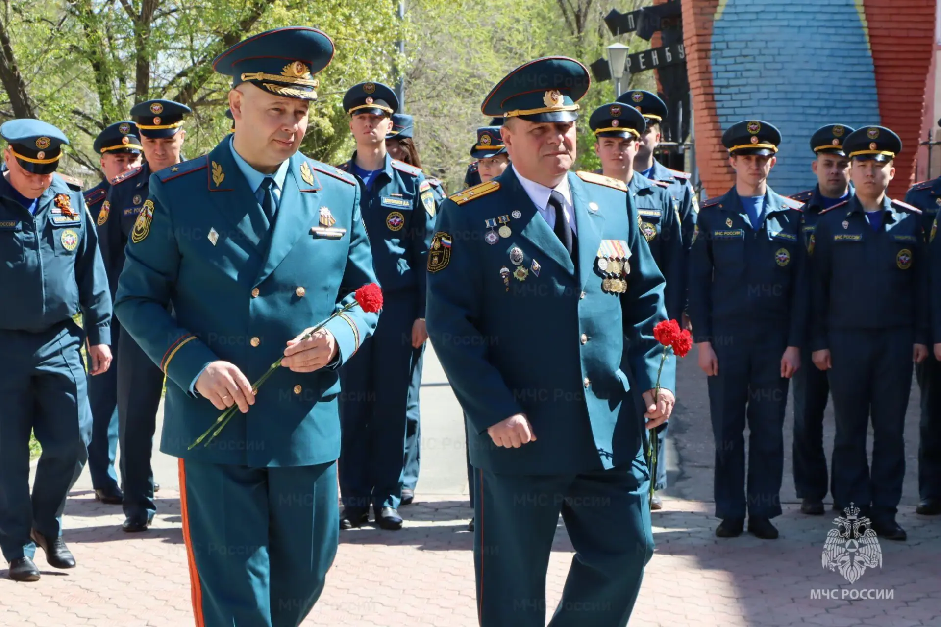 Руководство, сотрудники, ветераны службы и семьи тех, кто отдал жизнь, спасая других, собрались у мемориала "Пожарным Оренбуржья", чтобы возложить цветы.