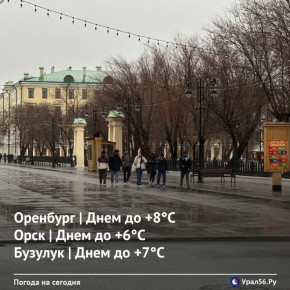 В Оренбурге сейчас +6°. Днём без существенных осадков, в первой половине дня туман. Ветер юго-восточной четверти 4-9 м/с. Температура воздуха +7°+9°. Атмосферное давление 758 мм рт.ст.