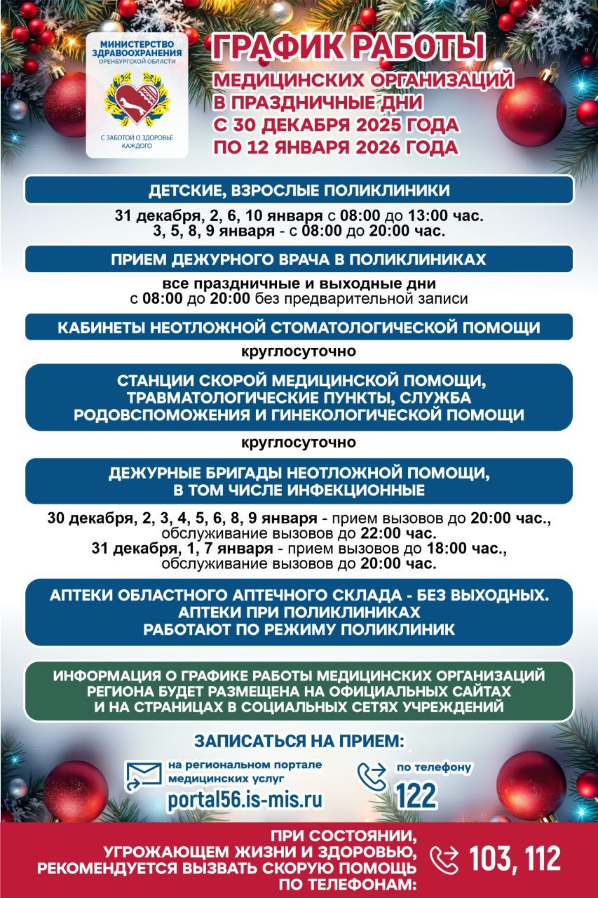 Согласно распоряжению министерства здравоохранения Оренбургской области детские и взрослые поликлиники работают 31 декабря, 2, 6, 10 января – с 8:00 до 13:00; 3, 5, 8, 9 января – с 8:00 до 20:00.