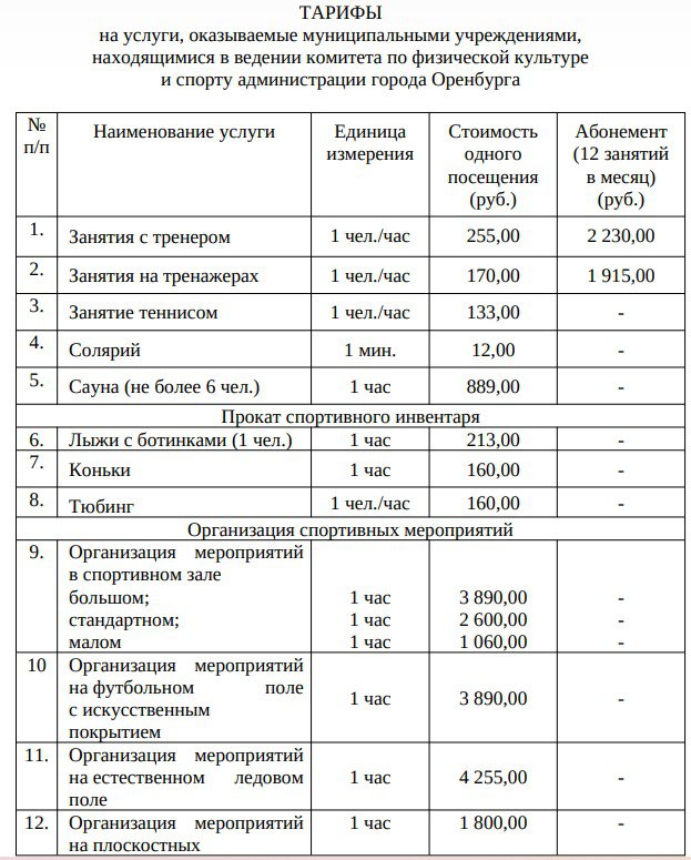 В Оренбурге с 1 января увеличились тарифы на занятия спортом в муниципальных учреждениях