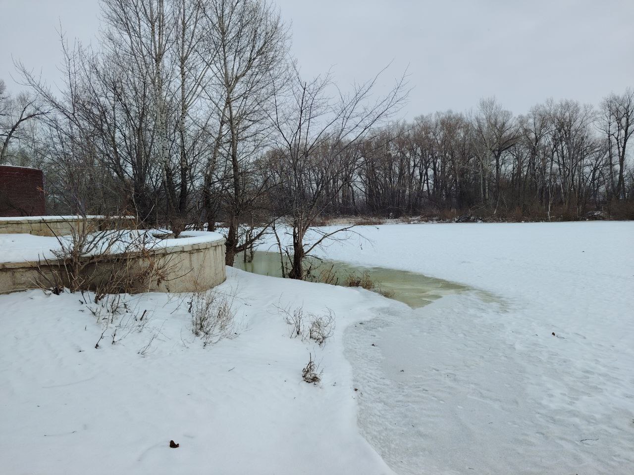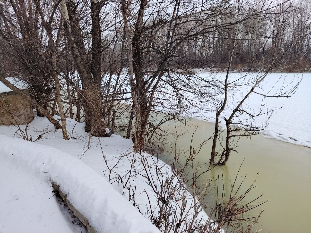 Вода пока не идёт поверху льда, но береговая кромка уже местами затоплена. Это предсказуемое поведение реки, и именно оно стало одной из причин отказа от иорданей на открытых водоёмах в этом году.