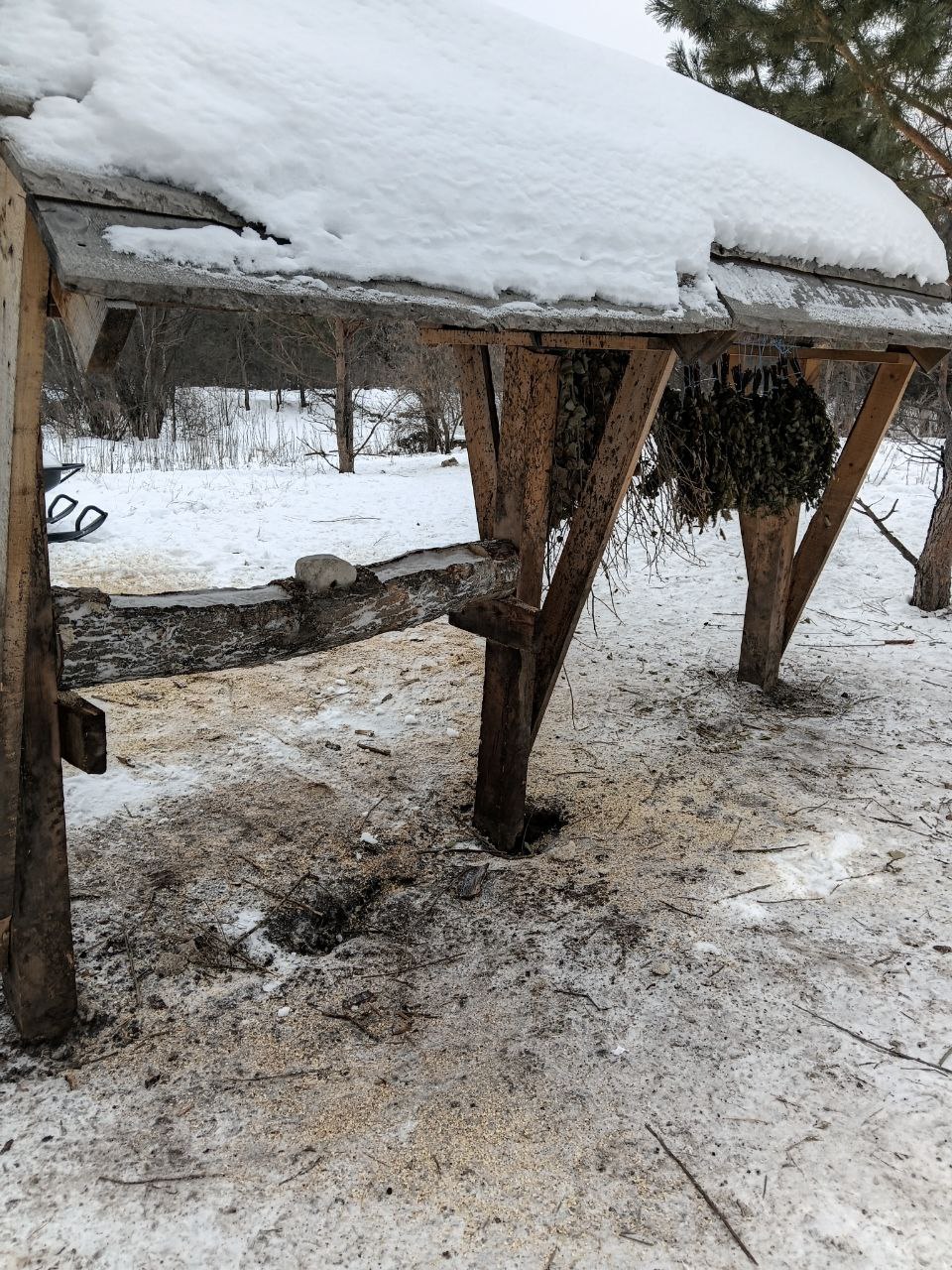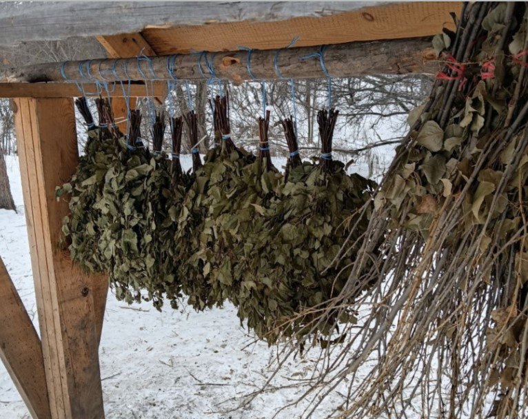 Связки веток, которые можно принять за банные веники, на самом деле являются частью зимнего рациона обитателей Бузулукского бора. За лето сотрудники парка заготовили около полутора тысяч таких «салатов» из ивы, осины, ольхи и березы. Сейчас их развешивают на подкормочных площадках в лесу.