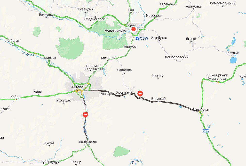 С 10:00 также перекрыли трассу в Актюбинской области – «Граница РФ – Мартук – Актобе – Карабутак – Кызылорда – Шымкент – Тараз – Кордай – Алматы – Хоргос – гр.КНР» на участке с 776 по 965 км, от Актобе до поселка Карабутак.