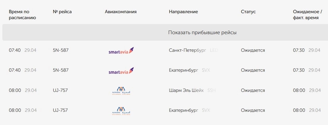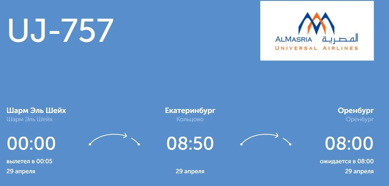 Самолет из Шарм-Эль-Шейха с прибытием по расписанию в 08:00 отправился в Екатеринбург.