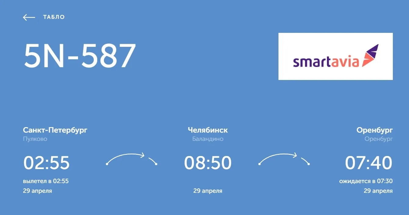 Борт из Санкт-Петербурга, который должен был прилететь по расписанию в 07:40, судя по онлайн-табло, перенаправлен в Челябинск.