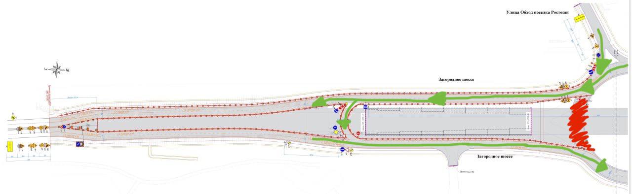 Автомобилистам придется выезжать на Загородное шоссе чуть дальше от привычного поворота кольца и делать разворот на специально выделенном месте. На схеме это отмечено зелеными стрелками.