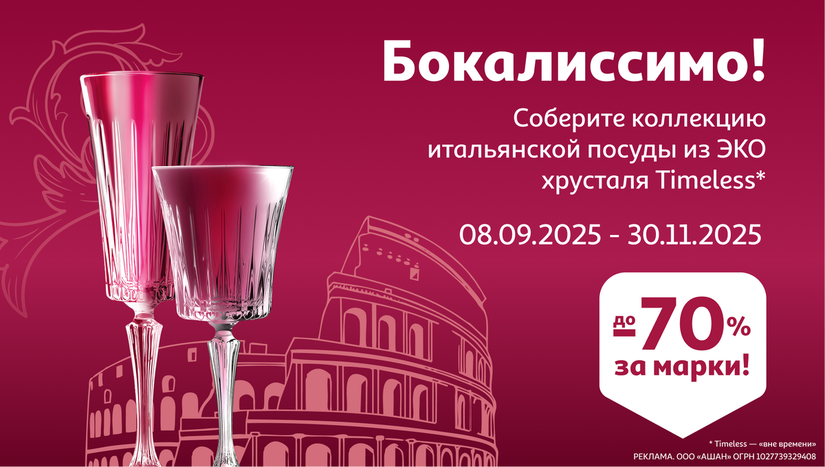 В период с 8 сентября по 16 ноября настоящие ценители эстетики и качества могут насладиться особым предложением на коллекцию итальянской посуды из экологичного хрусталя Timeless. Уникальная акция дает возможность получить скидку до 70% за накопленные марки за каждую покупку на сумму 400 рублей, сообщает Дзен-канал "АШАН Россия".