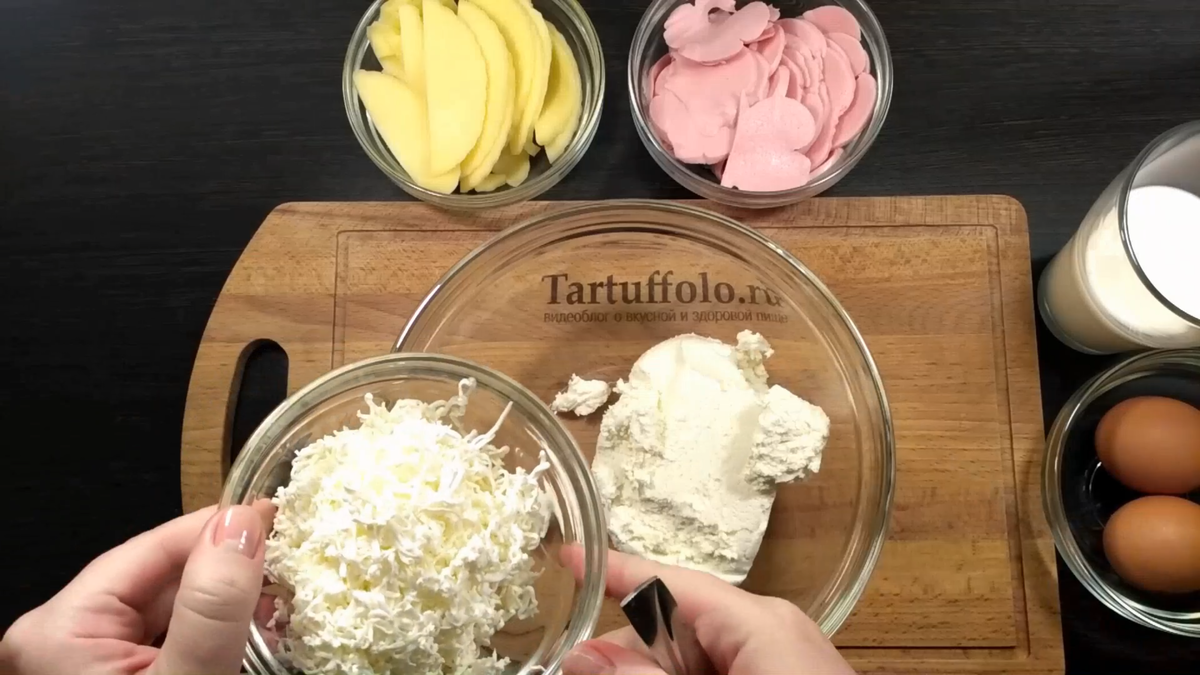 Начать стоит с творога и сыра. Творог можно оставить как есть, а сыр желательно натереть на мелкой терке или размять вилкой, если это фета. Затем в отдельной посуде разбить два яйца, добавить по вкусу соль и перец. Влить 150 мл молока: сначала половину, тщательно перемешать, чтобы не образовались комочки, после чего добавить вторую часть и снова перемешать до однородной массы.