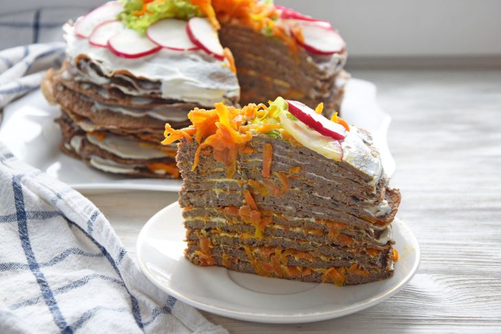 Далее взбиваются 4 яйца, к ним добавляются молоко и соль. Обжаривать нужно яичную массу порциями, сделать из нее несколько омлетов. Далее нужно собрать торт, выложив слоями печеночные блины, яичные, а также помидоры, нарезанные кружочками. После останется только украсить изделие зеленью.