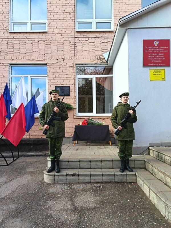 В Соль-Илецком индустриально-технологическом техникуме торжественно открыли мемориальную доску выпускнику, Герою России Ерлану Уркумбаеву. Сержант погиб в январе 2024 года во время спецоперации, спасая своих подчиненных.