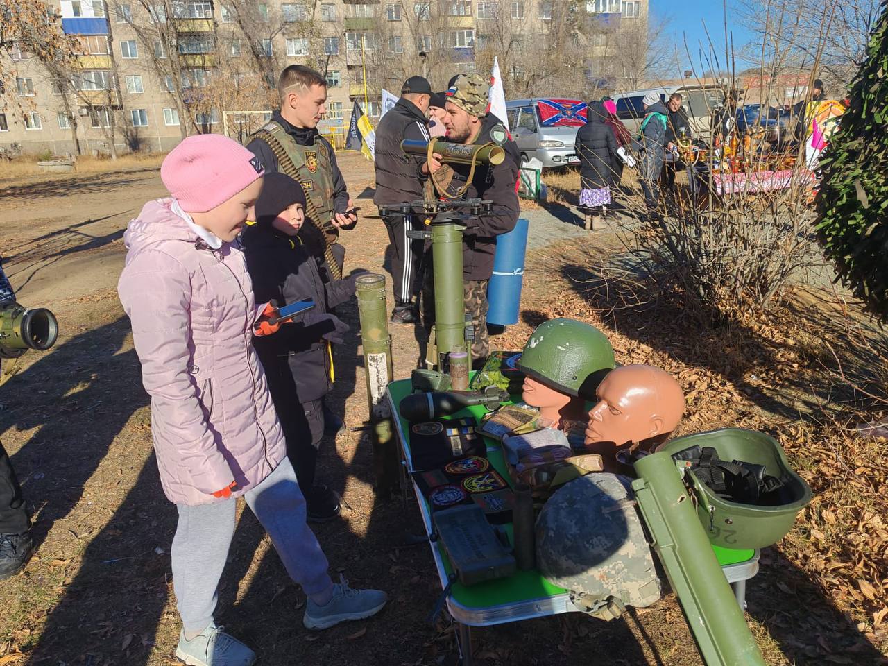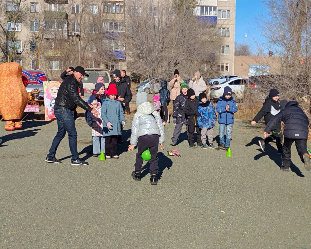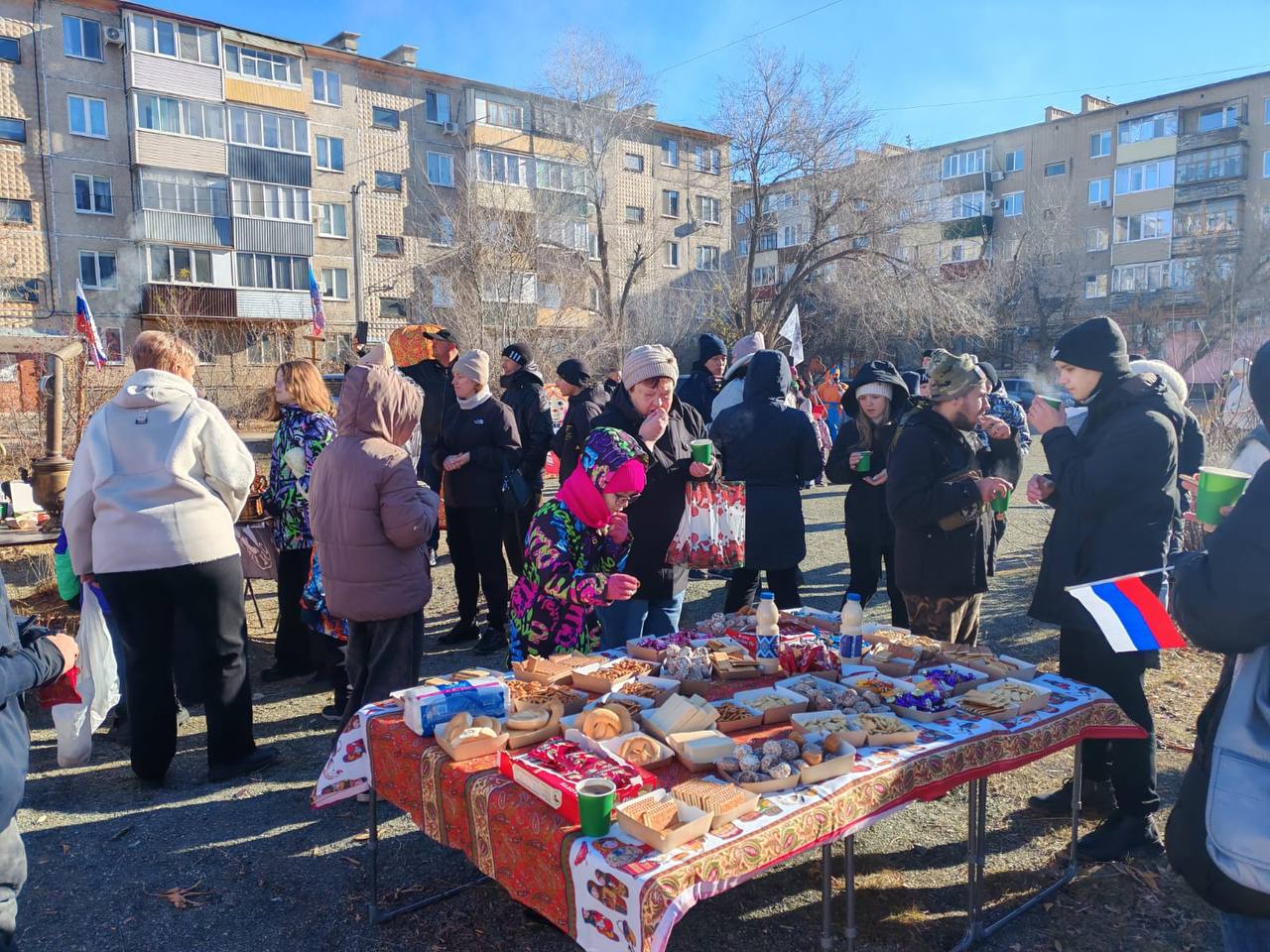 Малыши вместе со скоморохами водили хороводы. Ребята постарше учились оказывать первую медицинскую помощь. Взрослые мерились силой в традиционных русских забавах и знакомились с выставкой военного снаряжения. Гости общались, веселились и согревались ароматным чаем из самовара.