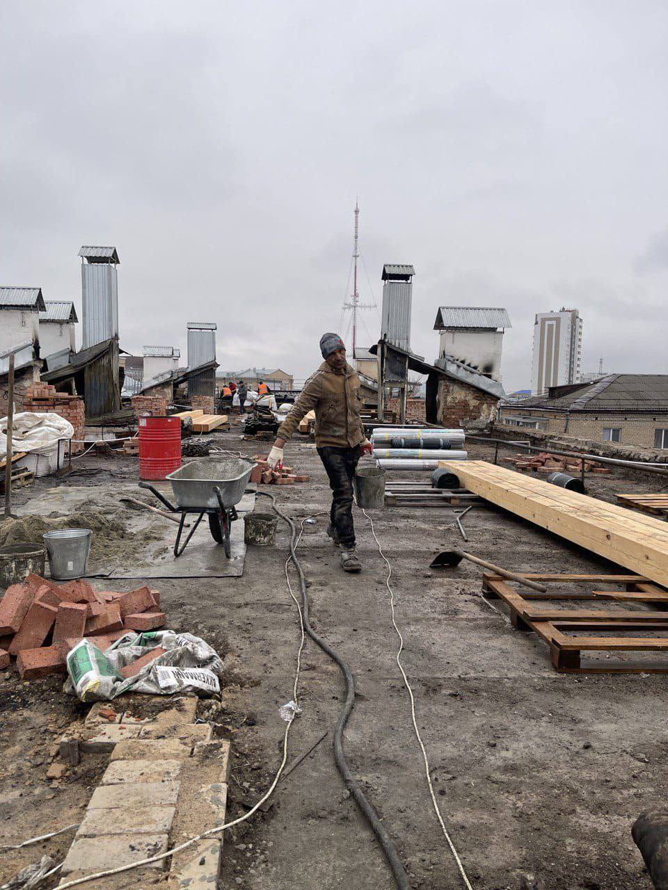 За неделю крыша полностью расчищена. На данный момент рабочие завершили ремонт парапета на 30%. С завтрашнего дня начнется сбор конструкции кровли. Весь необходимый материал для этого уже на объекте. Металл закуплен, оплачен. Доставка на площадку будет осуществлена по мере необходимости.