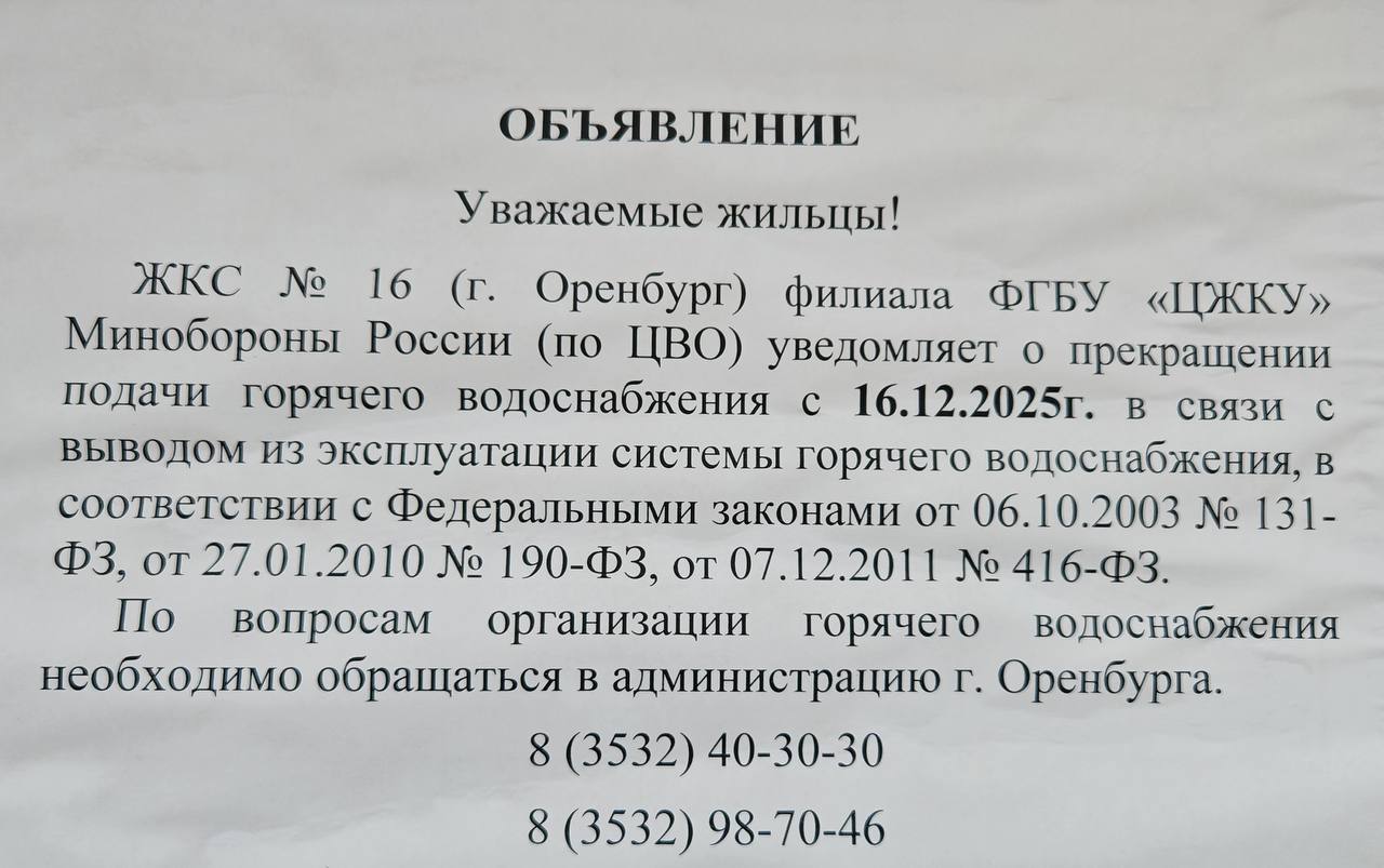 Жители домов 58, 58/1 и 52/2 по улице Краснознаменной в Оренбурге выразили обеспокоенность из-за объявлений о полном отключении горячей воды с 16 декабря 2025 года.