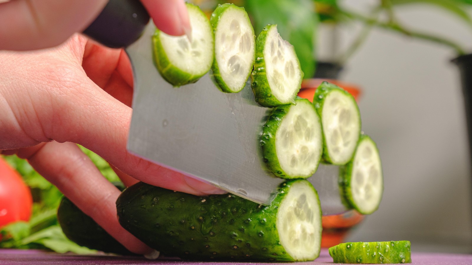 Во-первых, такой способ нарезки огурцов уже в процессе подготовки избавляет их от излишков воды. А значит в салате овощи не потекут, и он сможет храниться дольше. При этом кусочки останутся такими же хрустящими, как если бы вы их просто откусывали от целого овоща.