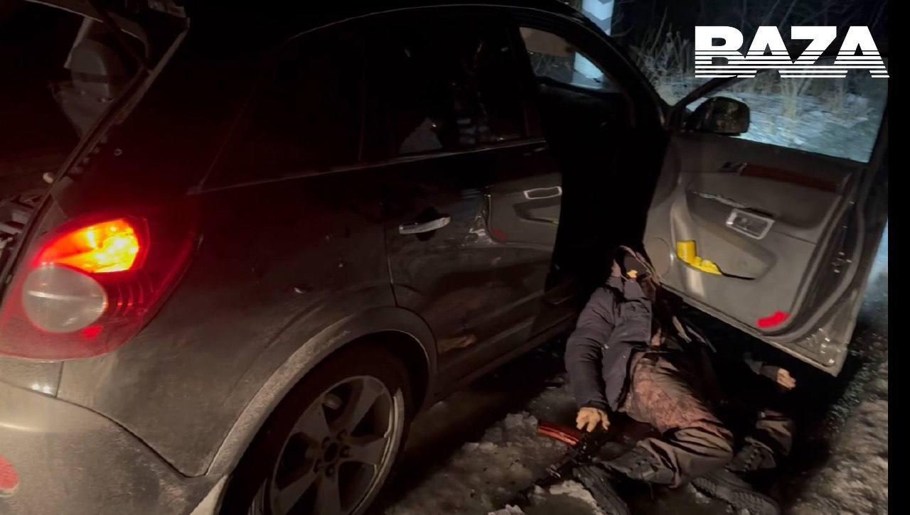На кадрах от ТГ-канала Baza - автомобиль со следами пуль, оружие и тела.