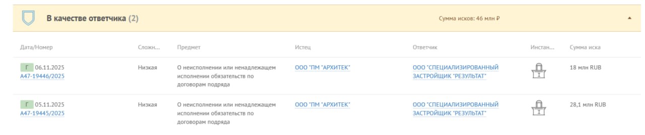 На сайте Арбитражного суда Оренбургской области опубликованы два иска к специализированному застройщику «Результат»: на 18 миллионов рублей и на 28 миллионов рублей. Заседания по ним пройдут 2 декабря.