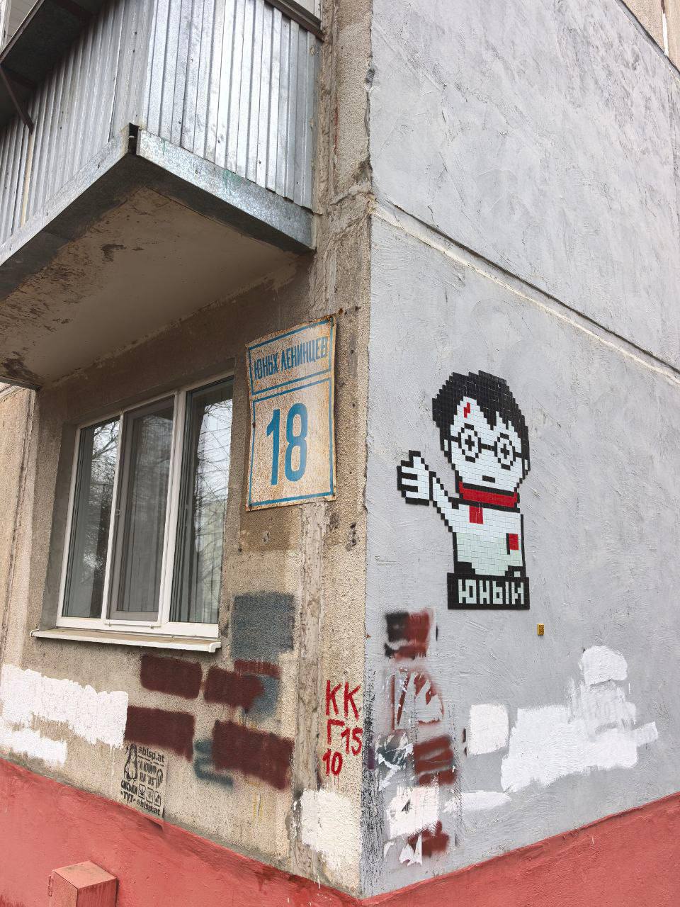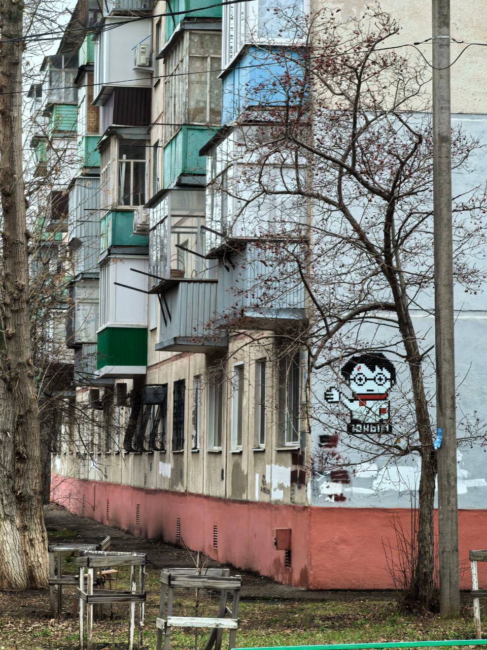 Художник изобразил бледного Гарри Поттера, поднявшего руку в характерном жесте, напоминающем позу Ленина — которого, напомним, недавно вернули в сквер имени Ленина. Под изображением — лаконичная подпись «юный».