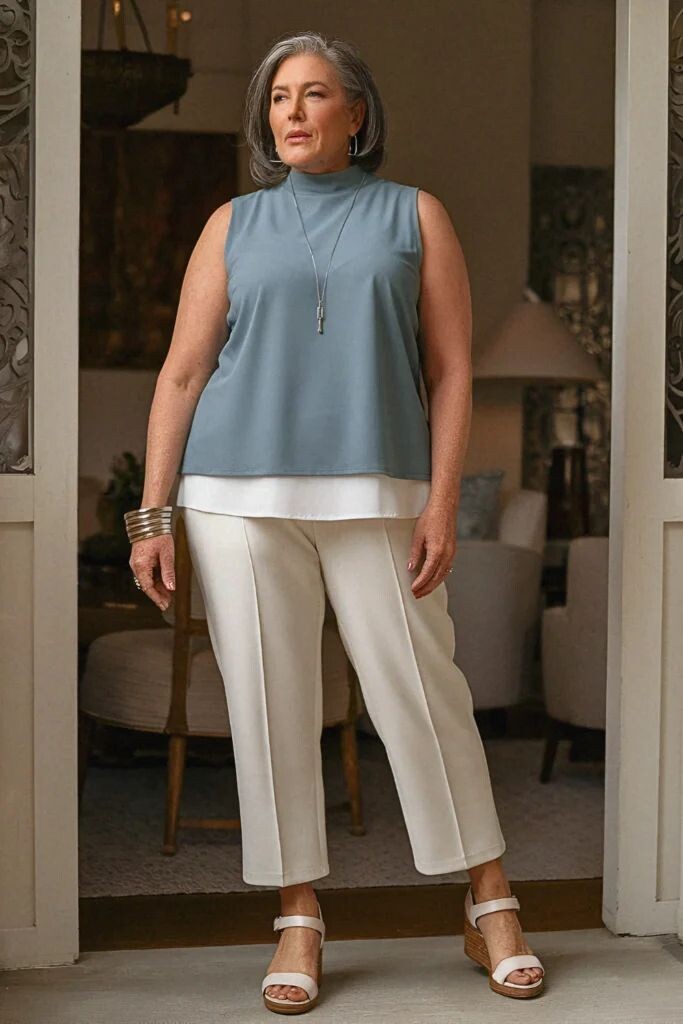 - Светлые укороченные брюки со стрелками: Они помогут визуально вытянуть силуэт и добавить легкости образу. Подпишите их светлым топом и серой безрукавкой. Обувь на танкетке станет элегантным финальным аккордом. Обратите внимание на минимальные украшения.