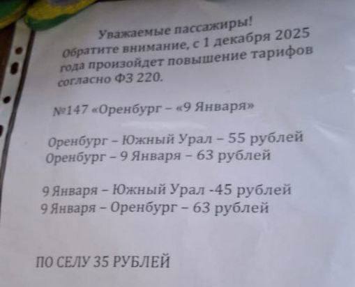 Согласно объявлению, действовать новые цены будут с 1 декабря. Стоимость проезда из Оренбурга до Южного Урала составит 55 рублей, а до поселка 9 Января — 63 рубля. Поездка между 9 Января и Южным Уралом теперь будет стоить 45 рублей, а тариф на маршрутах по сельским территориям установлен на уровне 35 рублей.