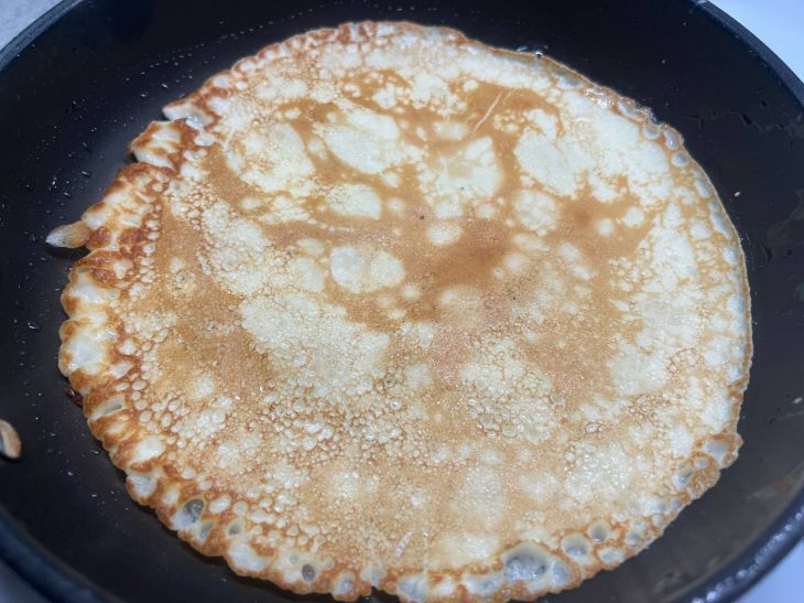 Лейте тесто половником и не переворачивайте блин, пока края не подрумянятся и не отстанут от поверхности.