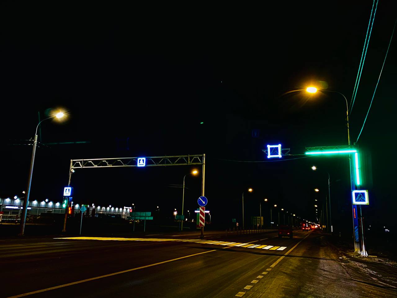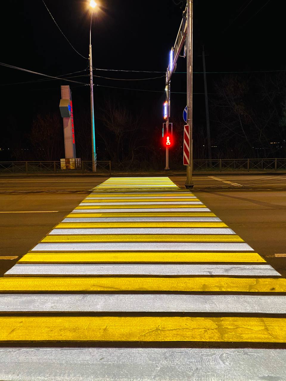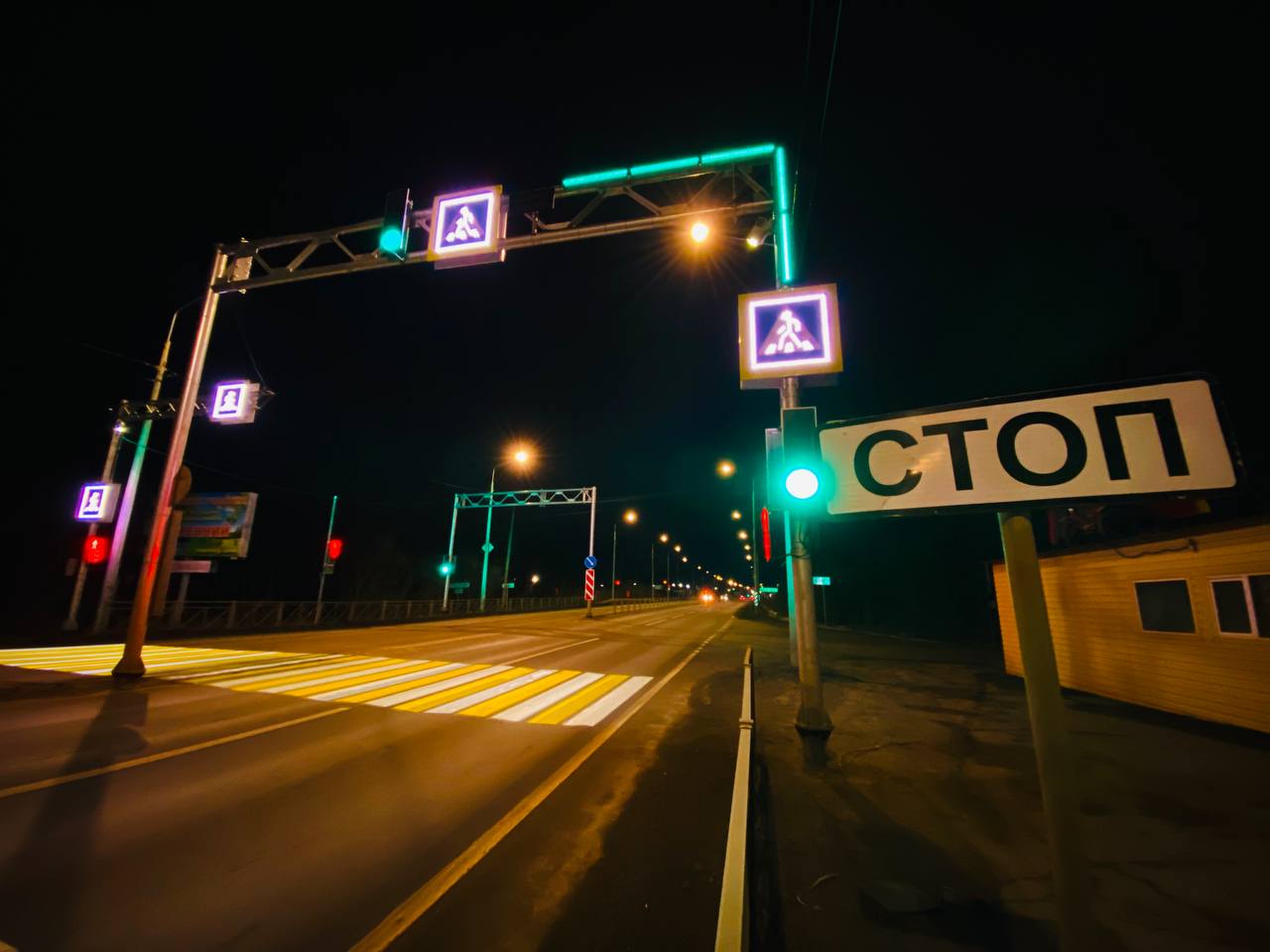 Впервые на региональных дорогах применена технология интерактивной передачи разметки типа зебра эффект достигается при помощи специальных проекторов, направленных на проезжую часть. Все переходы также оборудованы Г-образными опорами с расположенными на них над проезжей частью дорожными знаками со световой импульсной подсветкой, электронными табло Внимание! Пешеход! со звуковым сопровождением и табло отсчета обратного времени. Кроме этого, здесь есть видеокамеры с возможностью удаленного управления организацией дорожного движения.
