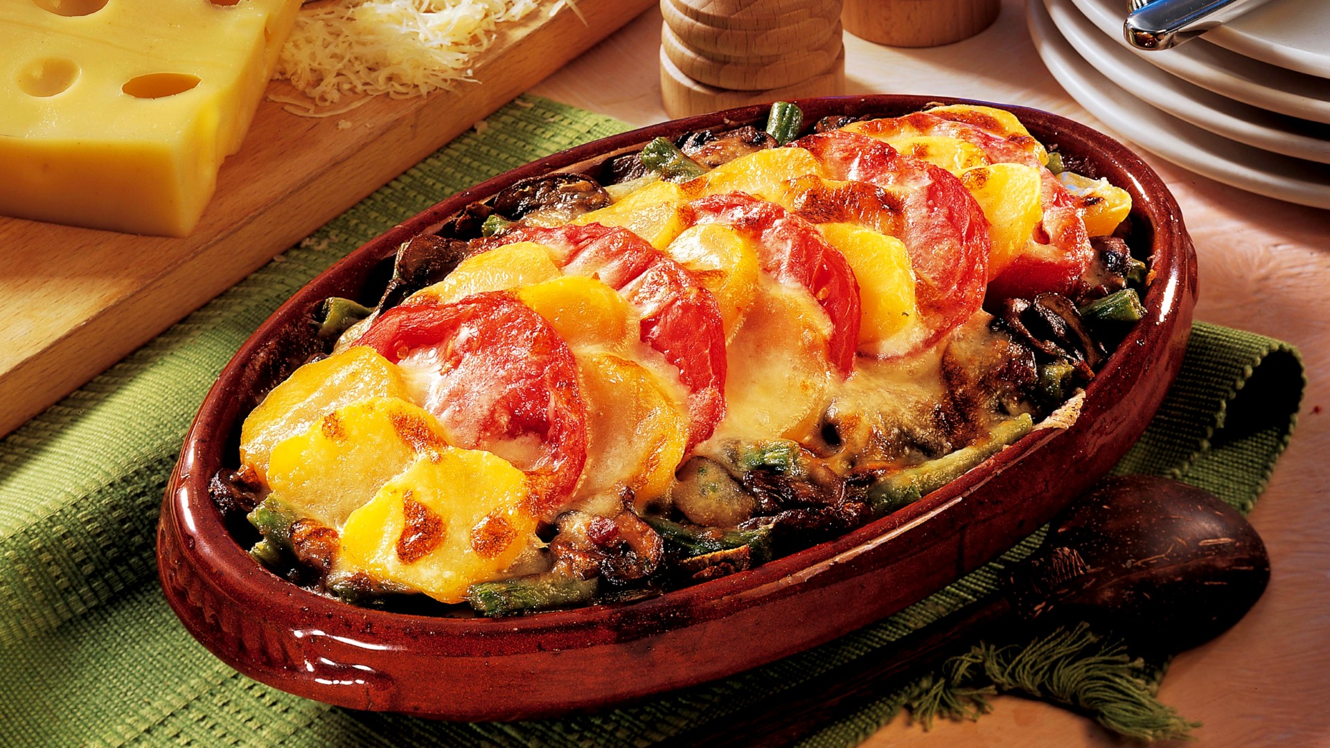 Сам картофель превращаем в пюре на воде. Помидоры нарезаем тонкими кружочками, сыр натираем на терке. Пришло время выкладывать слои.