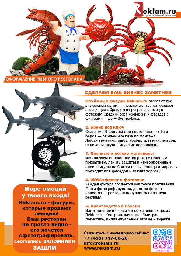 Компания Reklam.ru умело развивает этот тренд, предлагая множество моделей для оформления. С их помощью можно украсить ресторан фигурами акул, крабов и других морских обитателей. Используя современные и прочные материалы, такие как стеклопластик, компания гарантирует долговечность и стойкость изделий к атмосферным воздействиям. Фигуры могут быть адаптированы под индивидуальный стиль ресторана, что подчеркнёт его уникальность и создаст WOW-эффект.