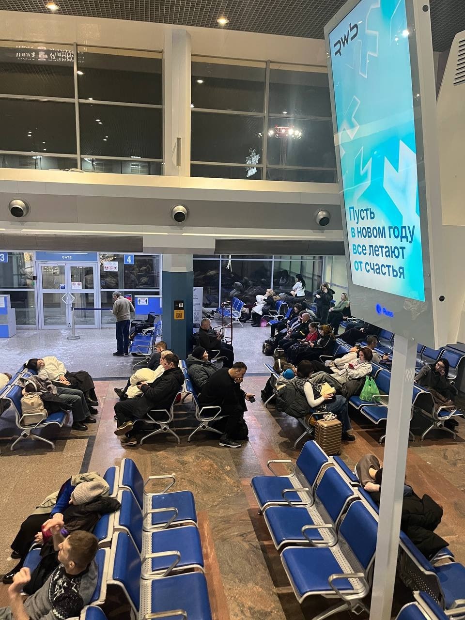 Судя по данным табло, закончена посадка на самолет в Санкт-Петербург, который должен был вылететь еще вчера в 21:50.