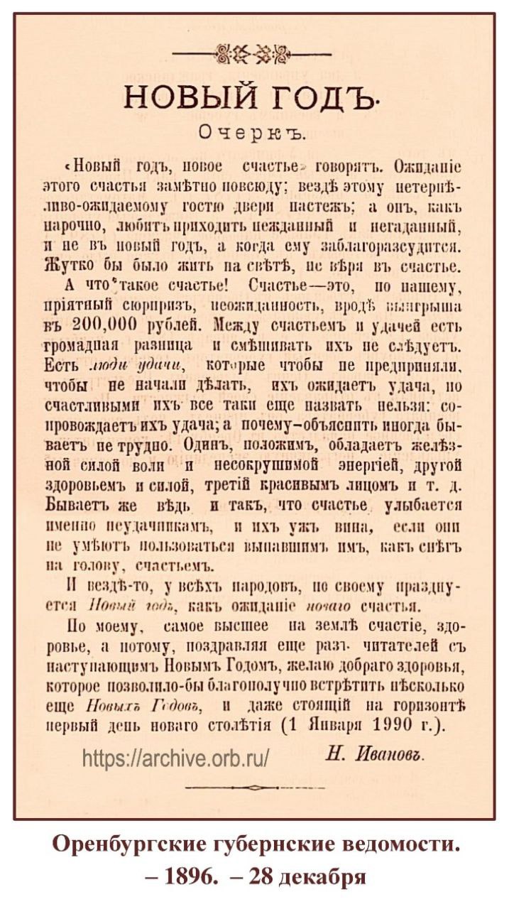 Автор Н. Иванов в своем очерке, датированном 28 декабря 1896 года, затронул тему, актуальную во все времена — веру в счастье. Удивительно, но мысли, высказанные более века назад, остаются современными.