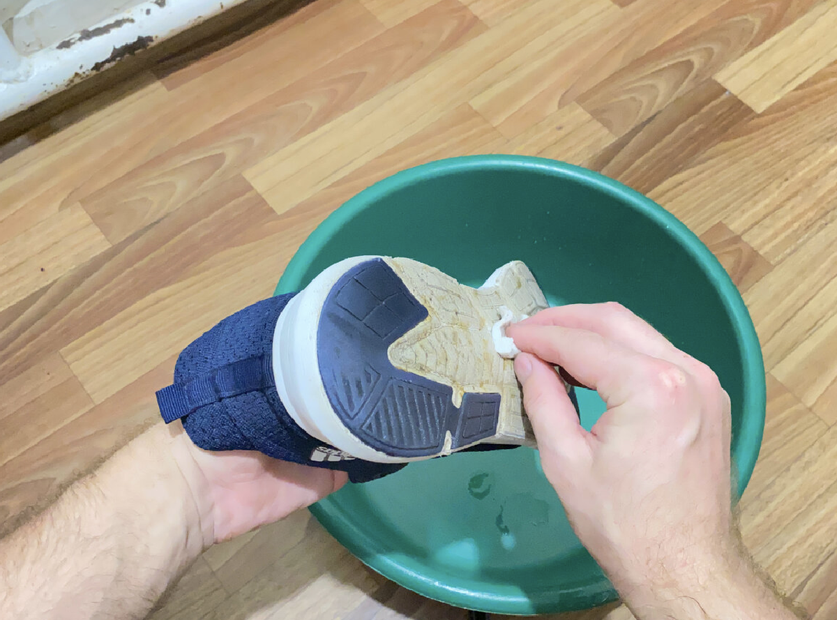 Также можно использовать зубную щётку, опустив её в спирт. Щётка более эффективно справляется с грязью, проникая даже в самые труднодоступные места. Просто проведите ею по подошве, и вы увидите, как кроссовки снова начинают сиять.