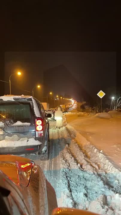 На втором видео — многокилометровая пробка на МКАДе от Строгино и... почти до Химок. Меньше она не становится. Трассу заметает снегом. По данным Дептранса, водителям будет круглосуточно помогать дорожный патруль ЦОДД.