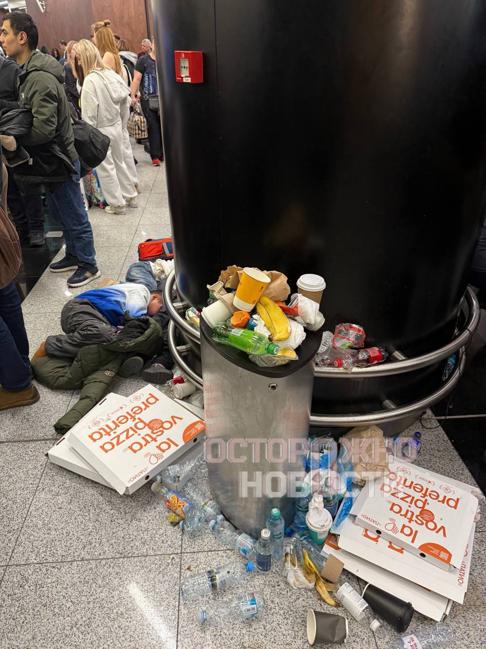 А «Осторожно, новости» пассажиры рассказали, что люди, которым приходится ждать свои рейсы из-за задержек, спят прямо на полу аэропорта. Сейчас там переполнены мусорки, а кафе заполнены спящими людьми.
