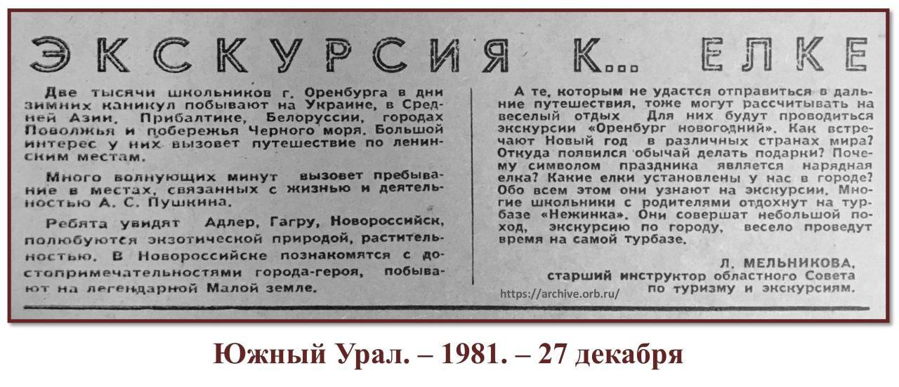Как рассказывает газета «Южный Урал», в начале 1980х Оренбургское бюро путешествий и экскурсий организовывало для школьников увлекательные поездки. Ребята отправлялись в путешествия по самым интересным местам: ездили в Среднюю Азию, Украину, Прибалтику, города Поволжья и на черноморское побережье.