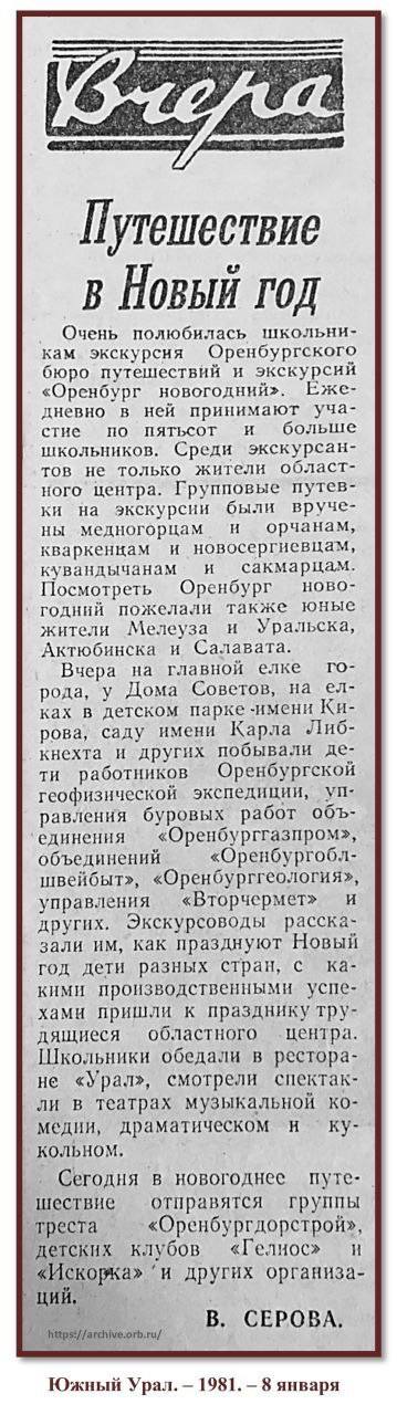 Также предлагали разлечься и в самом Оренбурге. Особенно пользовалась спросом у детей автобусная экскурсия «Оренбург новогодний». По программе юные путешественники посещали нарядные новогодние елки в областном центре, обедали в ресторане «Урал», а потом шли на спектакль в один из городских театров. Такая экскурсия обходилась в 30 рублей с человека.