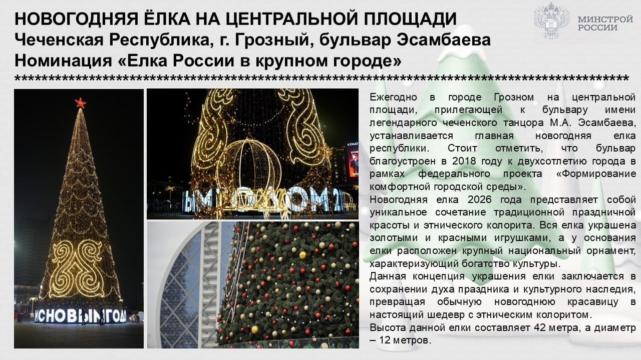 На момент публикации елка из Оренбурга набрала около 3% голосов. Лидирует в настоящее время новогодний символ из Грозного. В подборке представлены все «участницы».