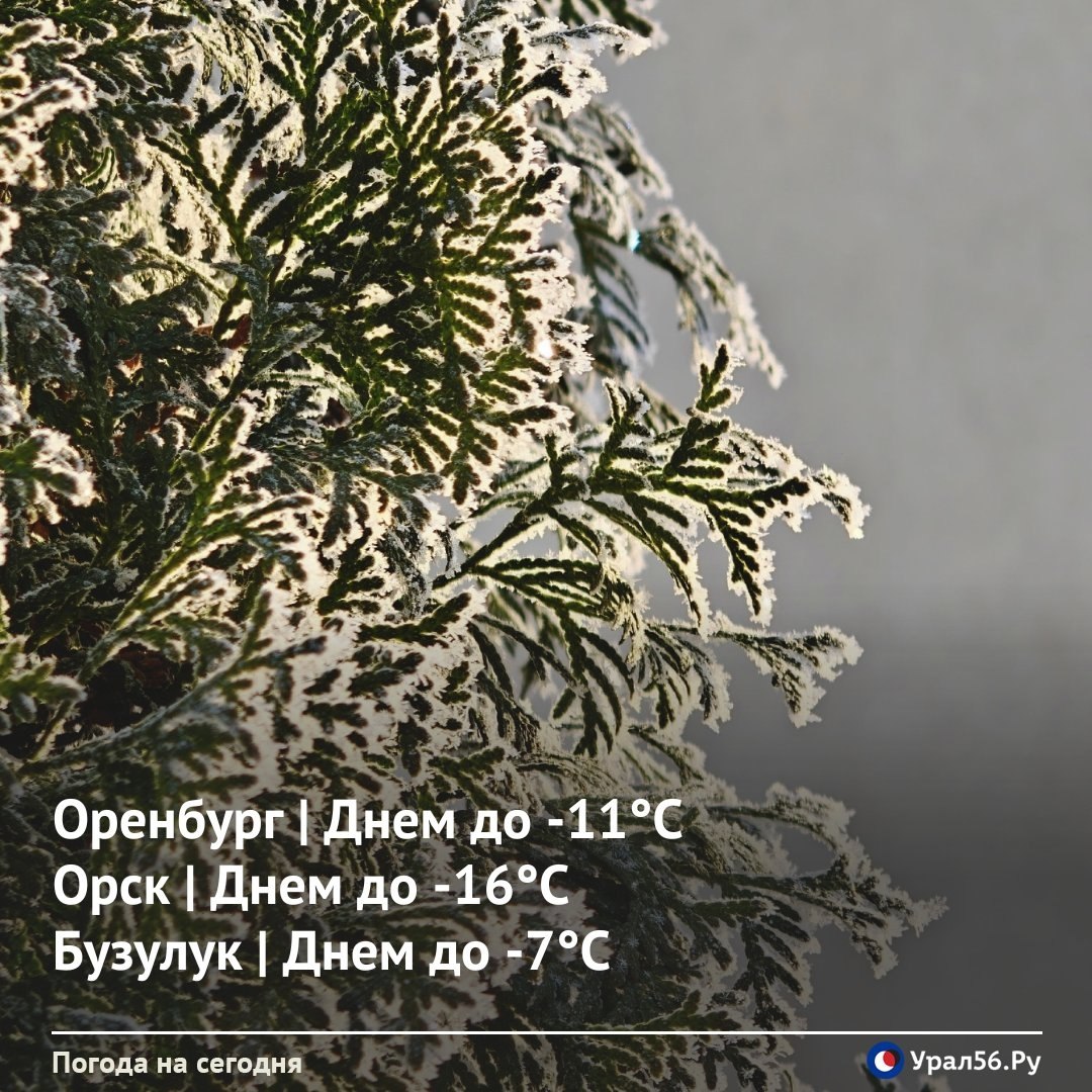 Днем облачно, без осадков.Температура воздуха в Оренбурге от -8 до -13; в Орске от -5 до -10; в Бузулуке от -5 до -10.Ветер западный 11 м/с. Давление: 755 мм рт. ст.и