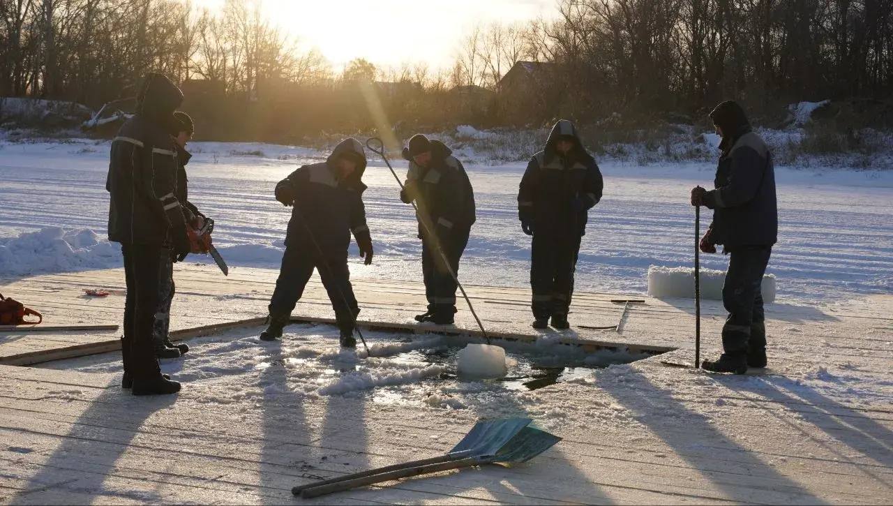 На месте уже подготовлены две проруби, подходы к ним и ведутся работы по установке теплых палаток для переодевания. Из вырубленных ледяных блоков будут собраны декоративные композиции и крест.