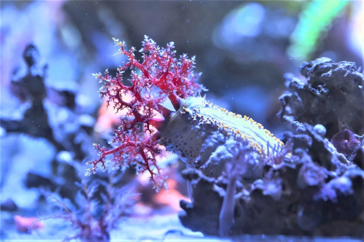 Приморский океанариум пополнился необычными обитателями, напоминающими яркие тропические фрукты. На первый взгляд кажется, что в аквариуме кто-то оставил ананас, однако при ближайшем рассмотрении становится ощутимо, что это морское яблоко, или Pseudocolochirus violaceus, которое начинает менять свою форму и активировать свои щупальца.