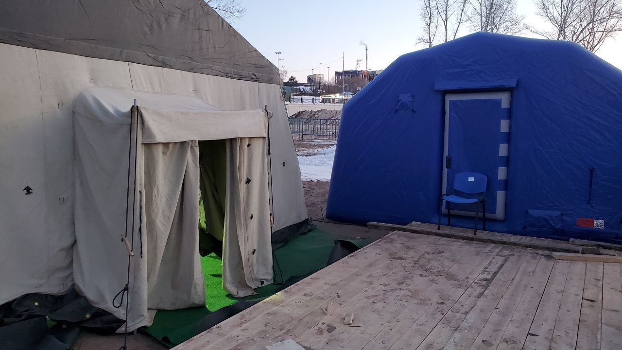 Установлена палатка для переодевания, предусмотрены ступени и перила для спуска от палаток к воде.