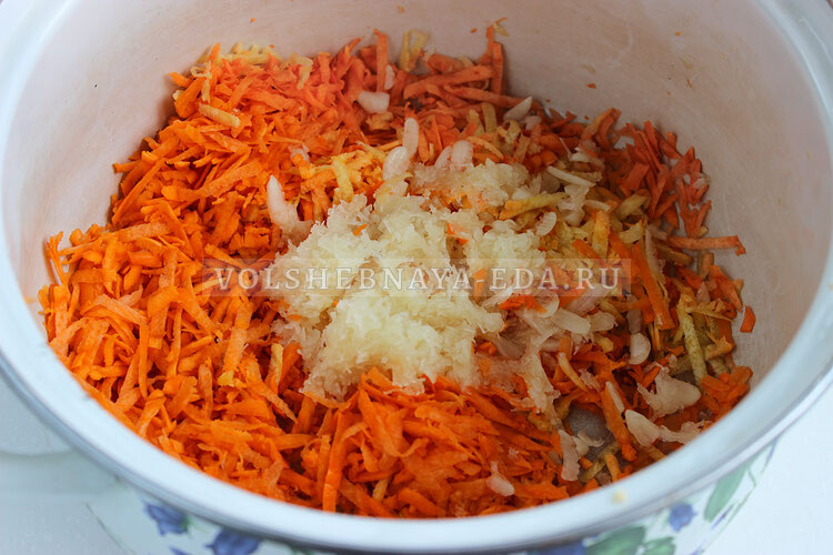 Перед началом кулинарного процесса необходимо очистить морковь и чеснок. Морковь следует натереть на терке, а чеснок можно пропустить через пресс или вместе со знатной связкой моркови прокрутить через мясорубку.