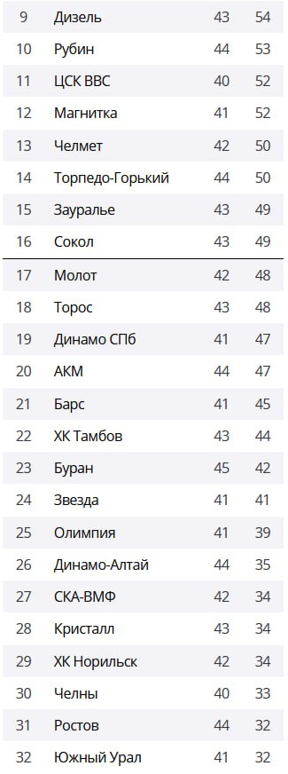 ВХЛ расположила хоккейный клуб Южный Урал на последнем месте турнирной таблицы. Отставание от зоны плей-офф 17 очков. До окончания регулярного чемпионата осталась 21 игра или 42 потенциальных очка.