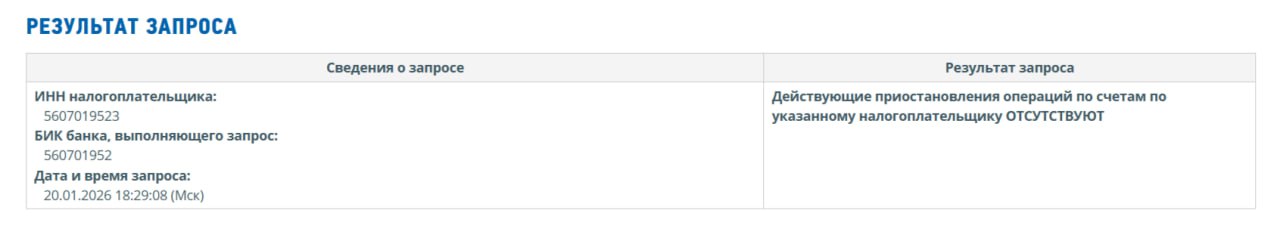 Урал56.Ру проверил на сайте службы эти данные утром 16 января и 20 января. Сейчас на сайте ФНС размещена информация: «Действующие приостановления операций по счетам по указанному налогоплательщику ОТСУТСТВУЮТ» (скрин №2).