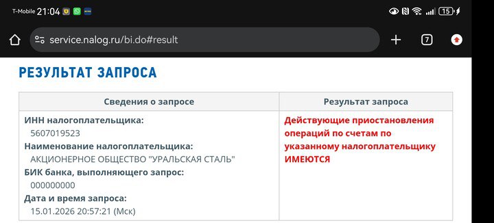 В тг-каналах ранее появилась информация о том, что Федеральная налоговая служба заблокировала счета компании «Уральская Сталь» из-за долга по налогам на 1,4 млрд рублей. В подтверждение информации был приложен якобы скрин сайта с надписью «Действующие приостановления операций по счетам по указанному налогоплательщику ИМЕЮТСЯ». Снимок (скрин №1) датируется 15 января 2026 года.