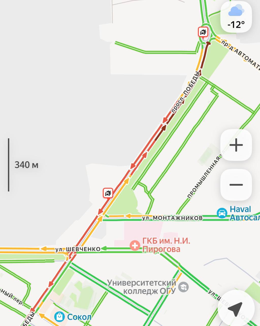 Быстро объехать затрудненный участок по проспекту Победу не выйдет, поскольку и там движение затруднено из-за двух ДТП.