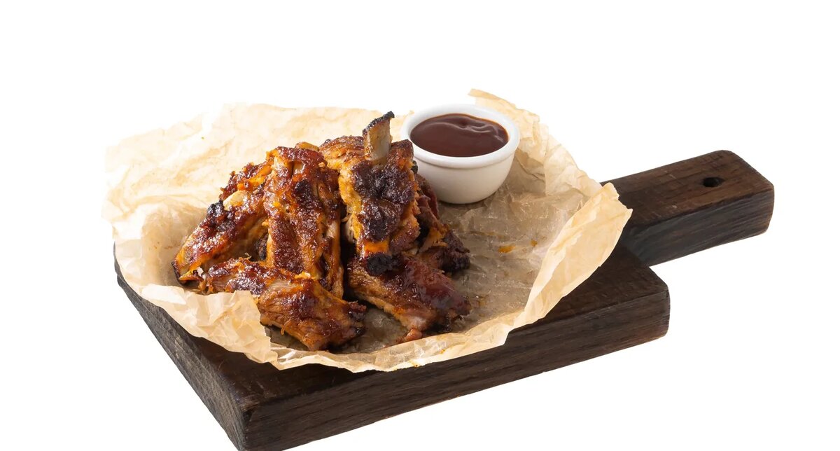 Готовые ребра достают, снимают фольгу и глазируют соусом барбекю, добавив к нему измельченный чеснок и немного вустерширского соуса, затем допекают 5–10 минут при 240 градусах без гриля, чтобы образовалась аппетитная блестящая корочка.