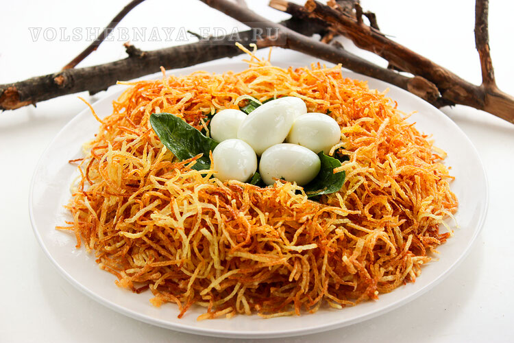Основу салата здесь формирует курица и яйца, а завершающее звено — хрустящая картофельная подложка, обжаренная до золотистой корочки. Подача превращает привычный набор продуктов в обстановку праздничного стола: вокруг горка картофеля формируется небольшое углубление, внутри же лежат слоями сверкающие яйца.