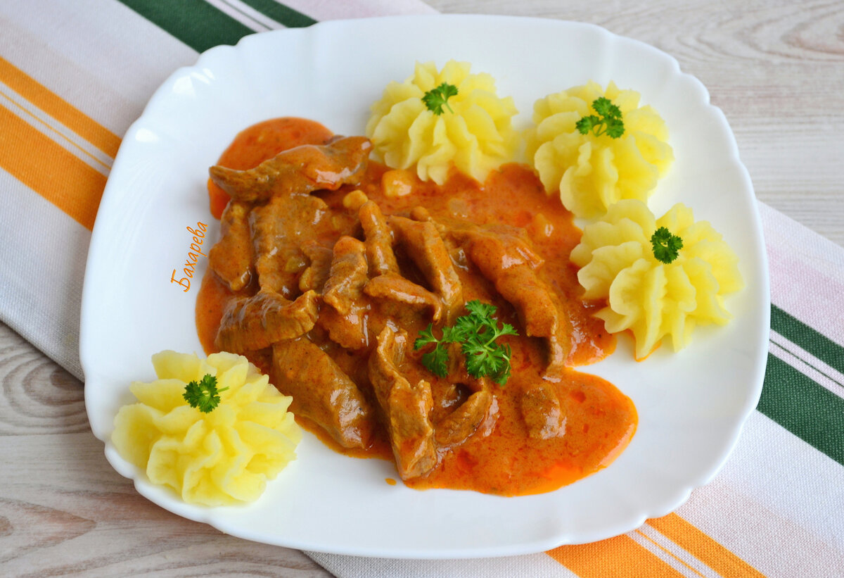 Подача проста и понятна: горячее мясо с соусом и густым пюре из картофеля, сверху — зелень по желанию. Этот рецепт напоминает, как часто хочется повторить знакомое блюдо и ощутить его домашнюю теплоту.